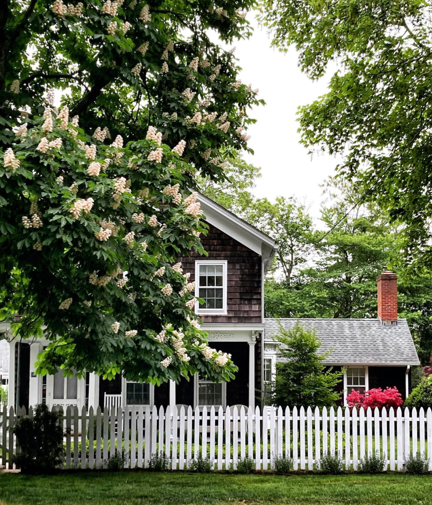 A white picket fence is a classic choice for a farmhouse-inspired garden. This fence is made from wood and painted white, and it has a simple, understated design.