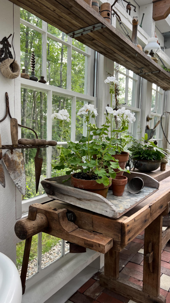 The potting bench is made from a few different types of wood, which adds to the overall farmhouse feel.
