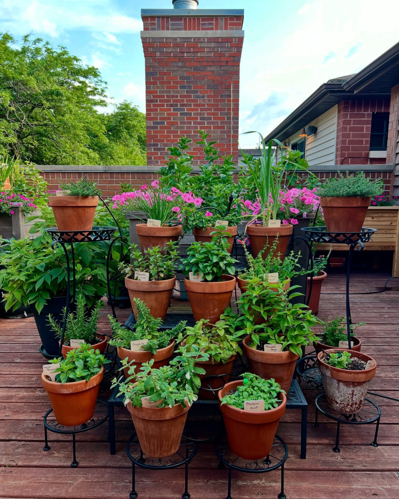 These little pots are perfect for a small herb garden. The terracotta pots give this garden a farmhouse look and feel.