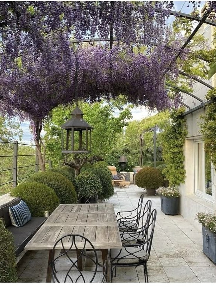 If you have a pergola in your garden, train some climbing plants to grow up and over it. This will add an element of shade to your garden, and it looks beautiful.