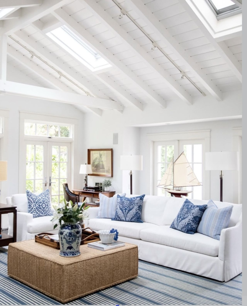 This coastal living room, designed by Leanne Ford, features a high ceiling with wood beams that have been painted white.