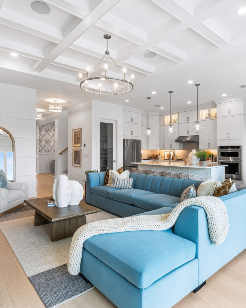 A large, open-concept living space with doors that open to the backyard is the perfect layout for a beach-inspired living room.