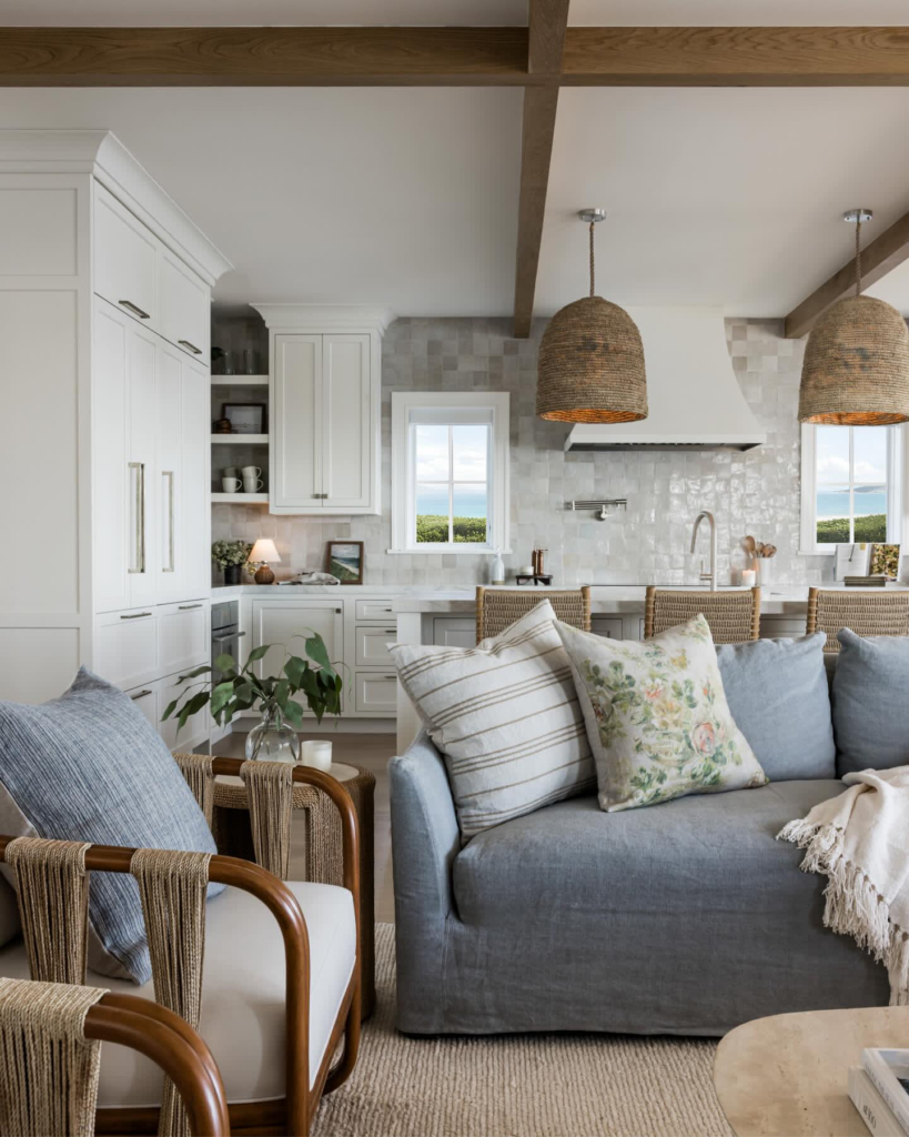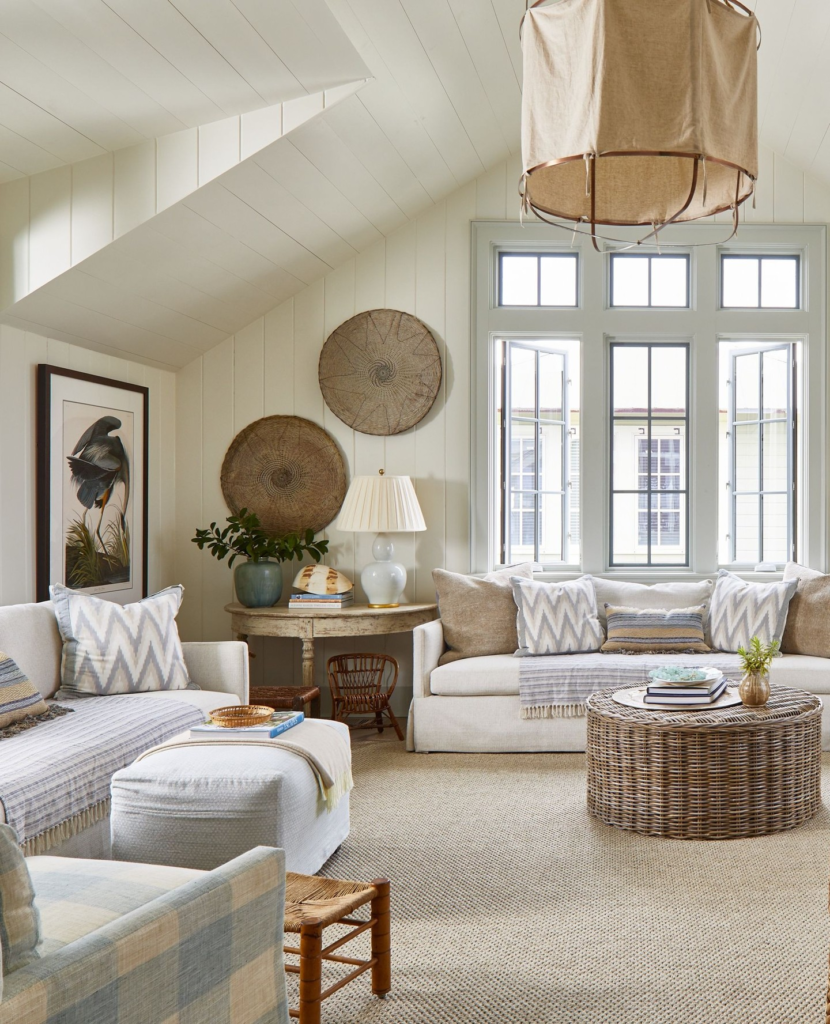 Wicker lighting is a popular choice for coastal-style rooms. This living room uses a pair of wicker pendant lights to add a touch of beachy style to the space.
