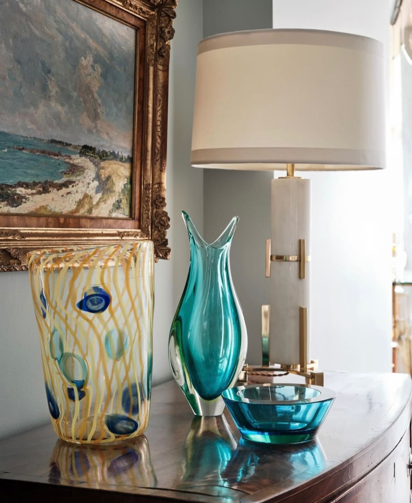 To keep the look cohesive, the designers used the blue in the artwork, throw pillows, and a few decorative objects throughout the room.