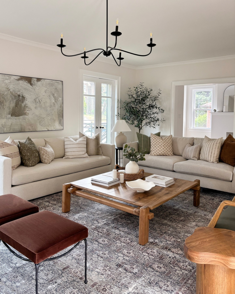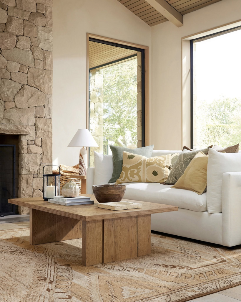 The wood coffee table ties in nicely with the wood flooring, and it contrasts beautifully with the light beige rug.