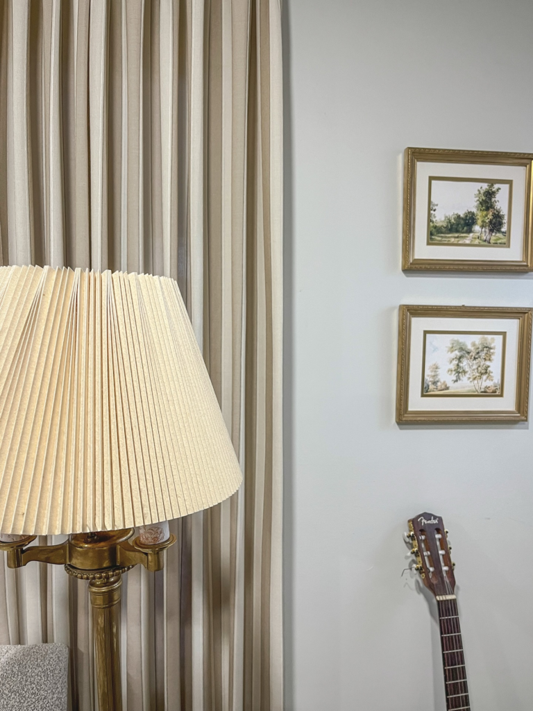 The coffee table, light fixture, and curtain rods all incorporate the gold metal and give this room a touch of glam.