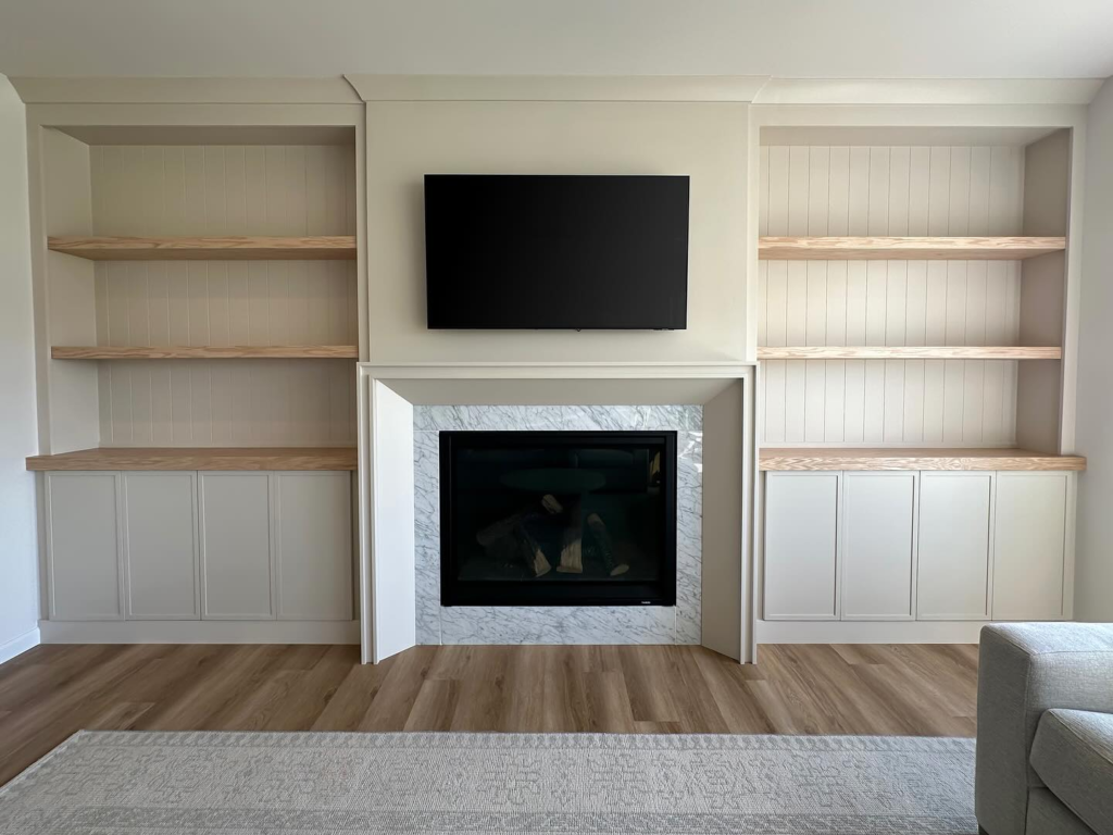 Custom built-ins are perfect for any room, but especially a living room. These built-in shelves are painted in a greige color, which is a mix of gray and beige, to match the walls.