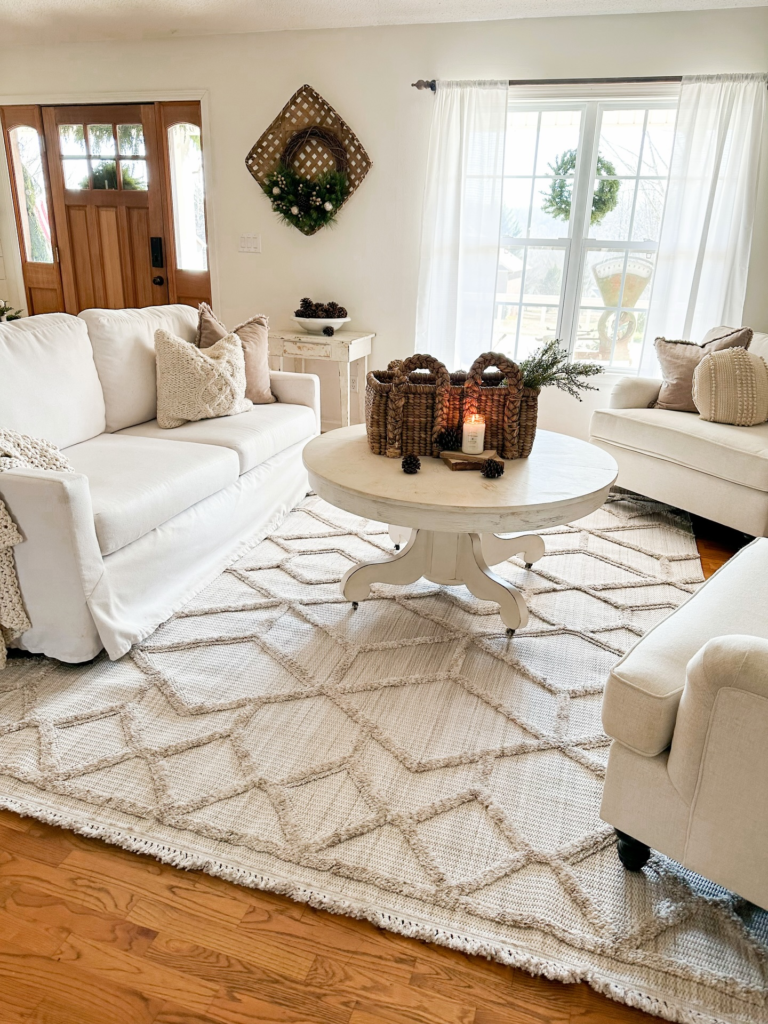 A great way to add texture to your living room is by adding soft, woven baskets. You can use them to store extra throws and pillows or just as a decorative element like in this living room.