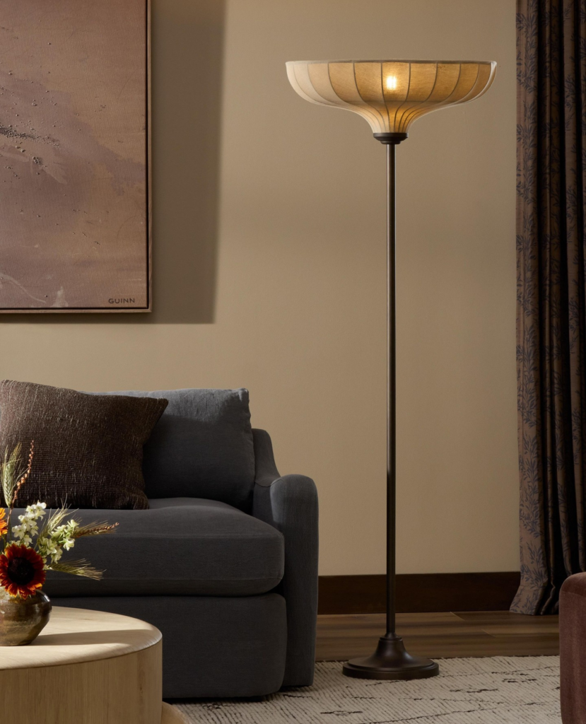 To the right of the fireplace, a matte black floor lamp is the perfect complement to the black fireplace screen.
