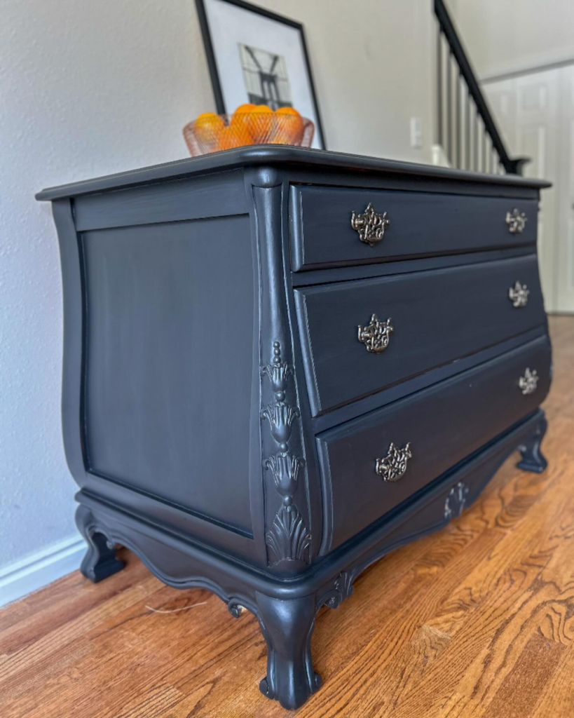 To get this look, you can use a chalk paint that comes in this color or mix your own using a chalk paint base and adding black paint to it.