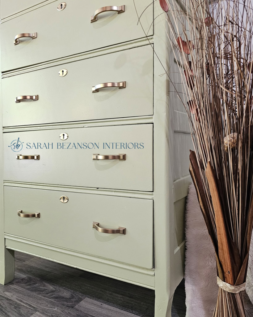 The soft olive green in this cabinet adds a pop of color to the room without being too overpowering.