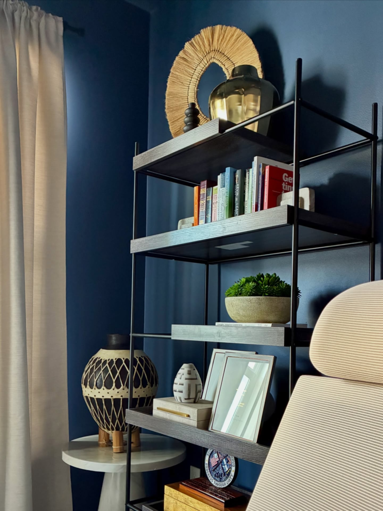 If you’re not ready to commit to an entire wall of navy blue, a bookshelf is a great way to try the deep color without overwhelming your space.