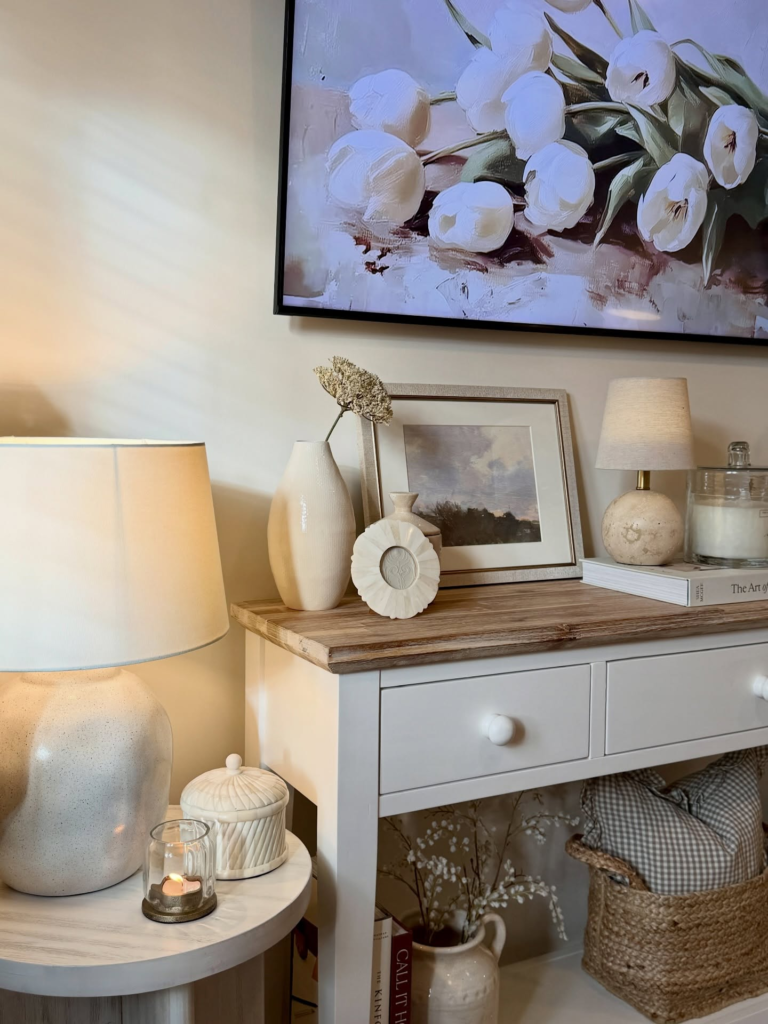If you want to add a pop of color to your space without going overboard, a pastel accent table is the perfect way to do it! This pale blush color is so soft and subtle, it adds a touch of warmth to the space without stealing the show.
