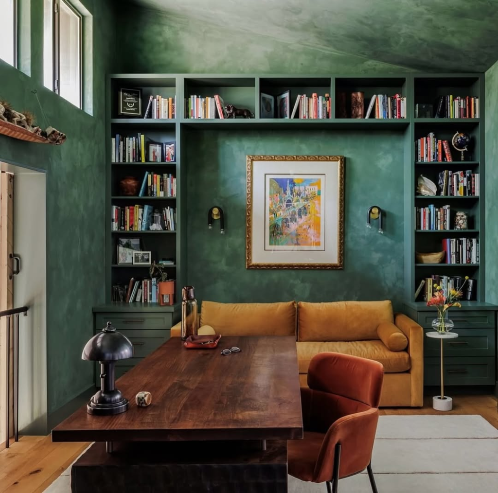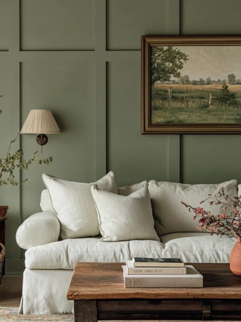 Olive green works well for both low- and high-light rooms. It has enough capacity to reflect light while still giving warm and cozy vibes.