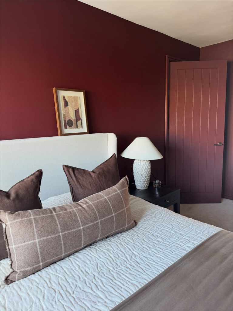 The accent wall in this bedroom is painted in a deep burgundy color, which gives the room a cozy and intimate feel.