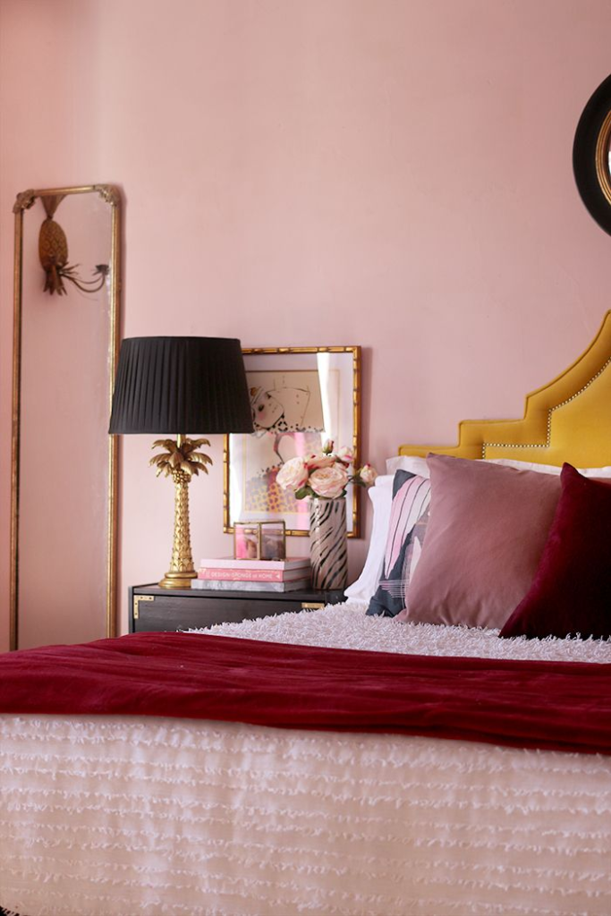 This room is a stunning example of how to mix blush and burgundy in a bedroom.