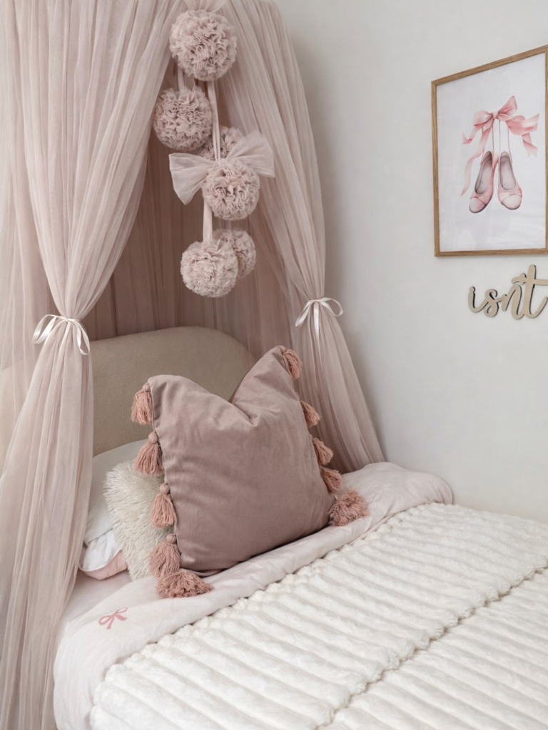 The blush pink and burgundy throw pillows tie in with the soft pink canopy, but the rest of the bed linens are a mix of cream and beige.