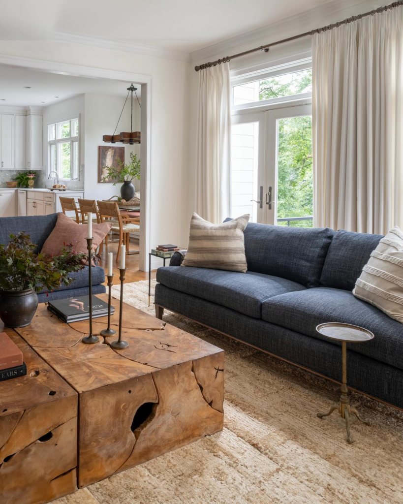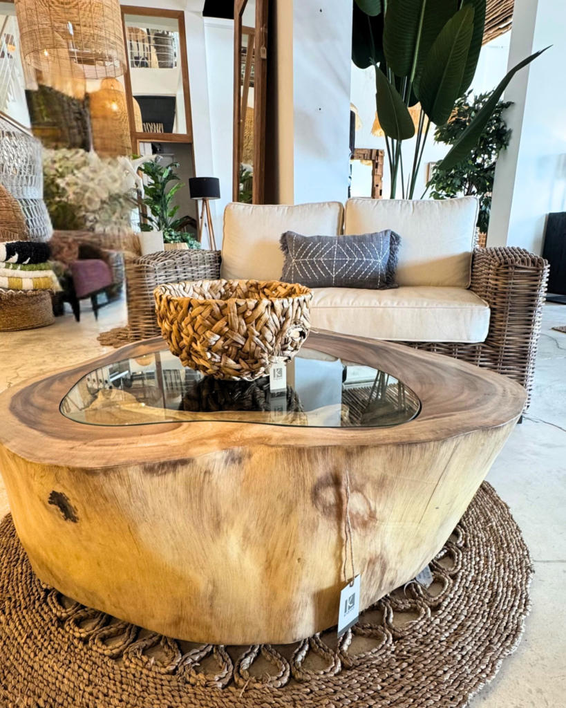 The driftwood coffee table in the middle of the space adds a rustic touch to the room’s boho coastal design.