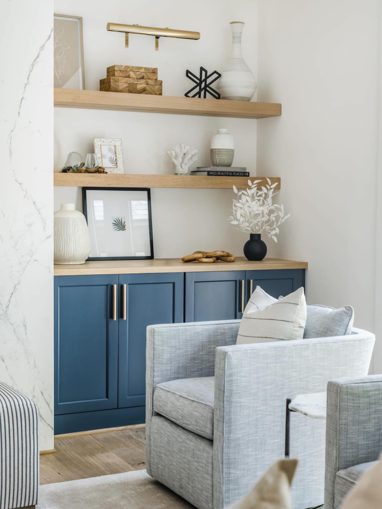 Pro Tip: When decorating open shelving, it’s important to make sure it doesn’t look too cluttered. Work with odd numbers and vary the height of your objects to create a balanced look.