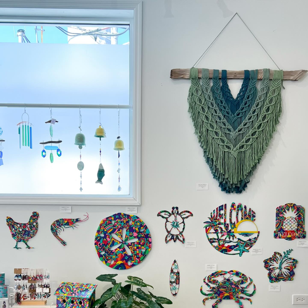The woven chairs and wall hanging bring in the boho style, while the greenery throughout the room ties in the coastal vibe. The gallery wall on the left side of the room adds even more color and texture to the space.