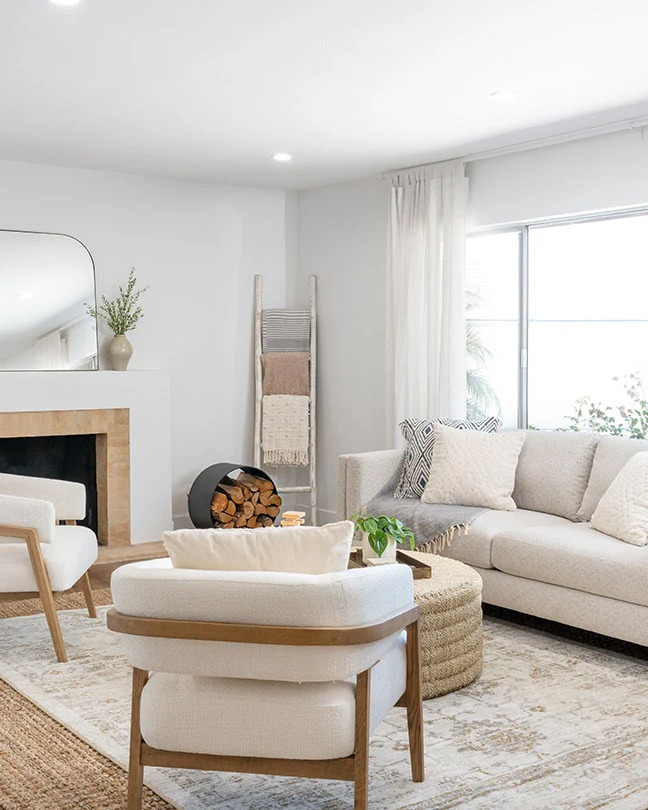 We love how the white upholstery on the sofa and armchairs is paired with a few caramel-colored pieces. This look is easy to emulate with a few throw blankets and pillows.