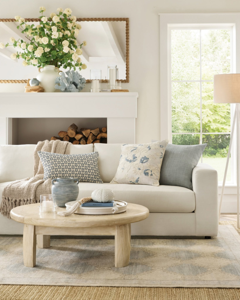 This cozy, coastal-inspired living room features a variety of throw pillows and a woven area rug in the same color palette for a cohesive look.