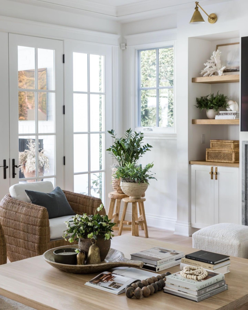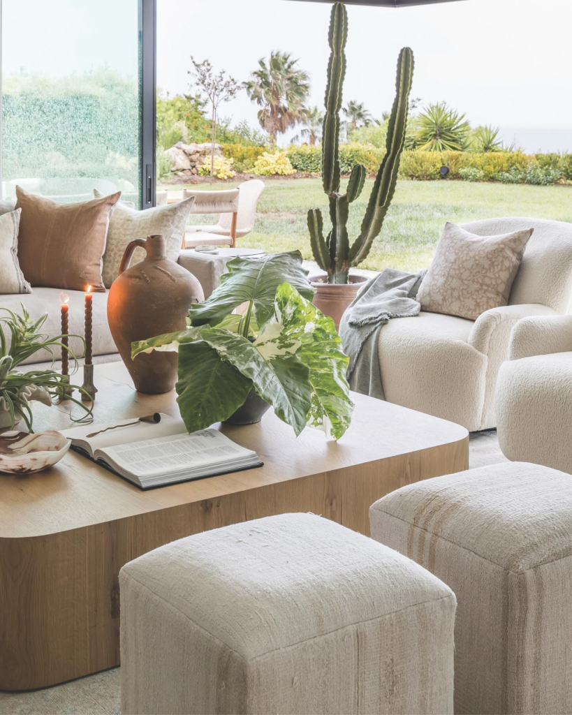 This interplay of light and texture adds depth to the space, enhancing its boho coastal charm. As the sun moves, it creates a dynamic play of shadows and highlights, further enriching the room’s organic aesthetic.