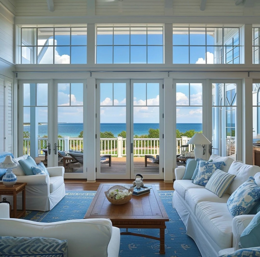 As the wind dances through the open windows, the curtains flutter gracefully, reminiscent of the calming waves outside. This delicate movement enhances the coastal vibe, making the space feel fresh and connected to the beauty of nature.