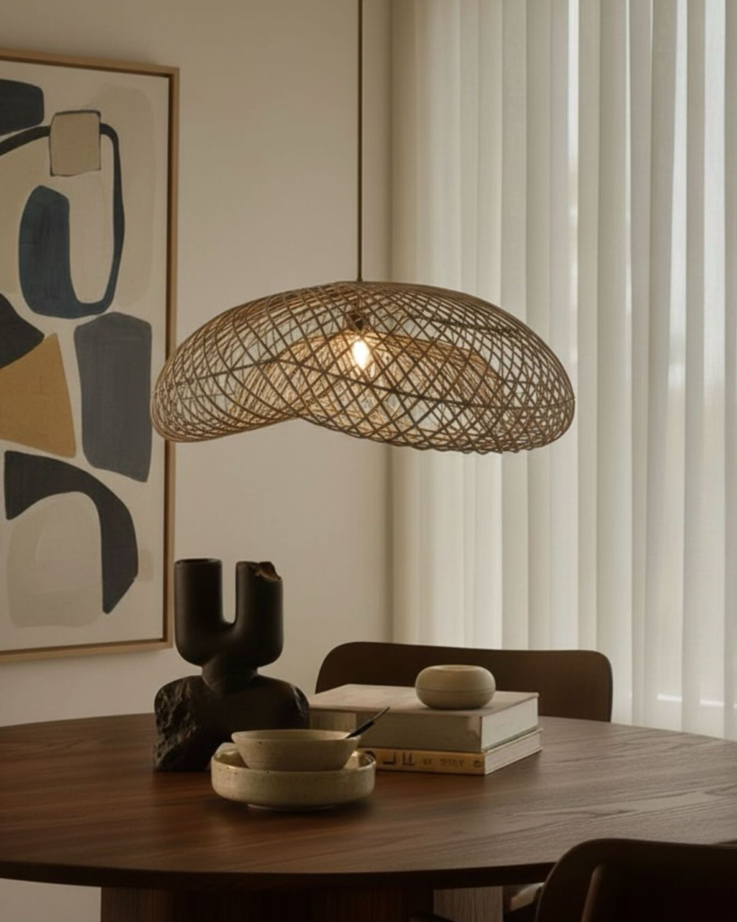Hanging rattan pendant casting warm textured shadows