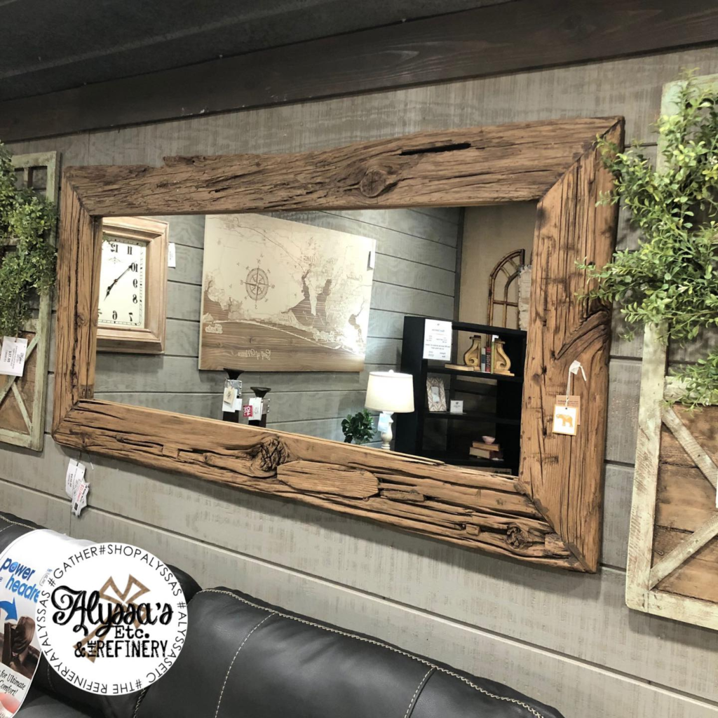 Driftwood mirror above a relaxed neutral sofa