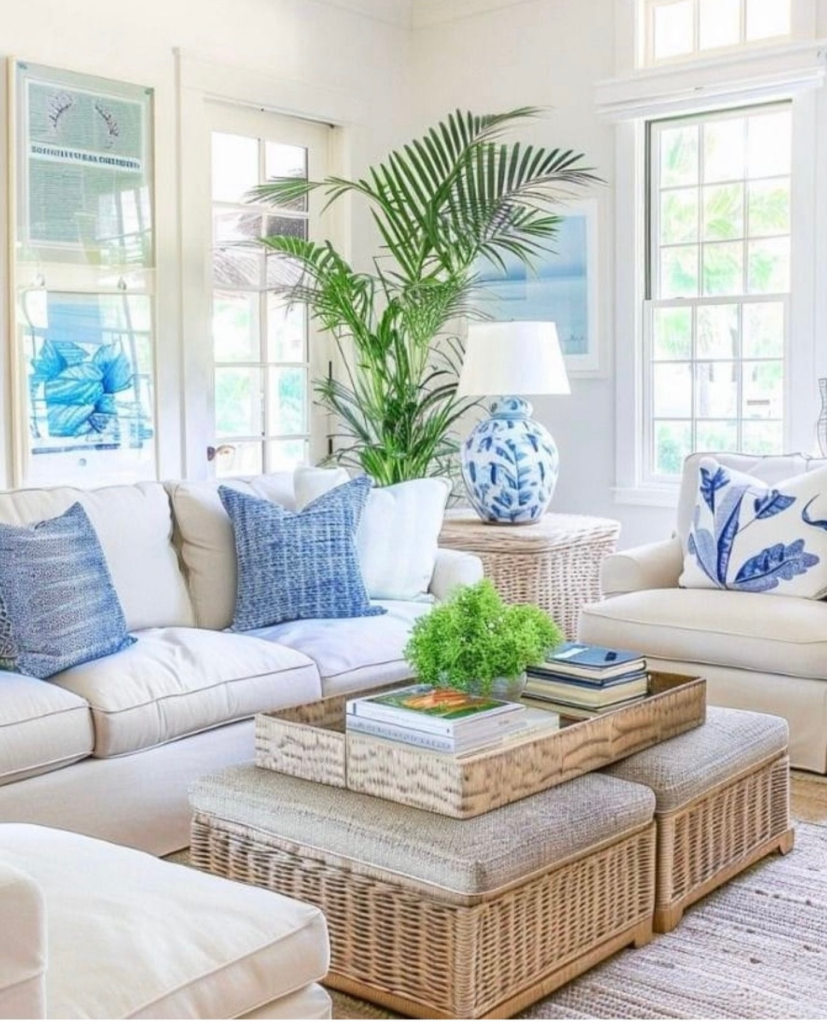 In a boho coastal living room, the interplay of mixed textures creates a dynamic and inviting atmosphere. Rattan furniture introduces an organic warmth, while soft linen upholstery offers comfort and a laid-back elegance.