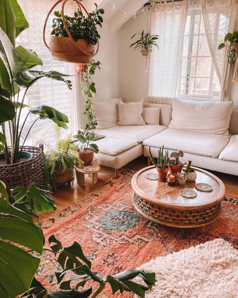 Natural rope decor accents are a great way to add a coastal touch to your boho living room.