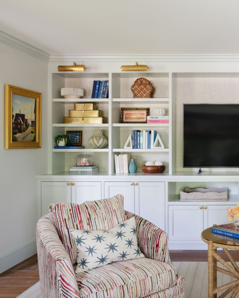 In this coastal living room design by Emily Henderson, the built-in open shelving is home to a collection of coral and shell decor.