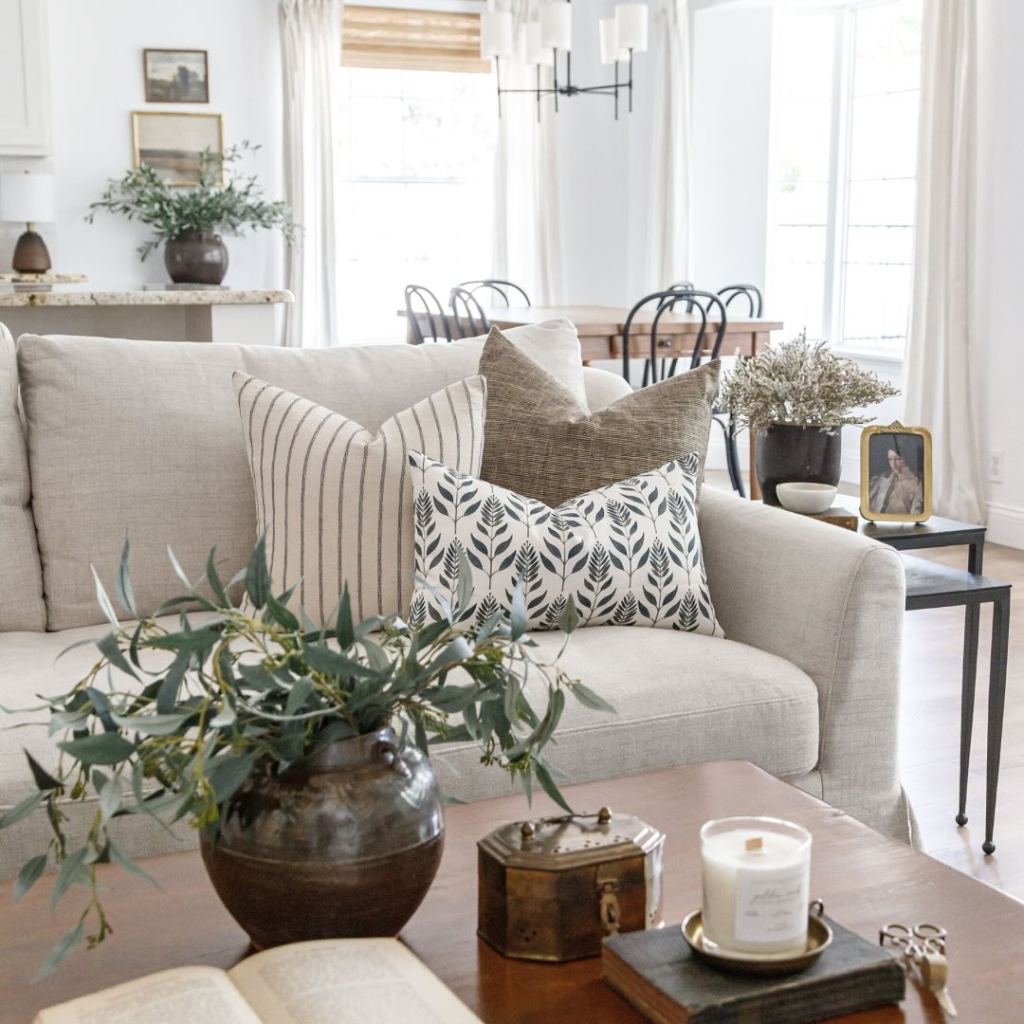 Here, the pillows feature a variety of textures, patterns, and designs. Then, to keep things cohesive, they’re all in a neutral color palette and have a common theme of tassels and fringe.