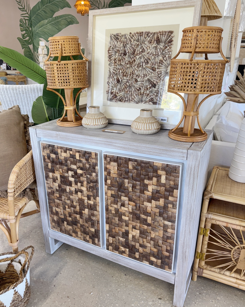 Cane-front cabinets styled with coastal accessories