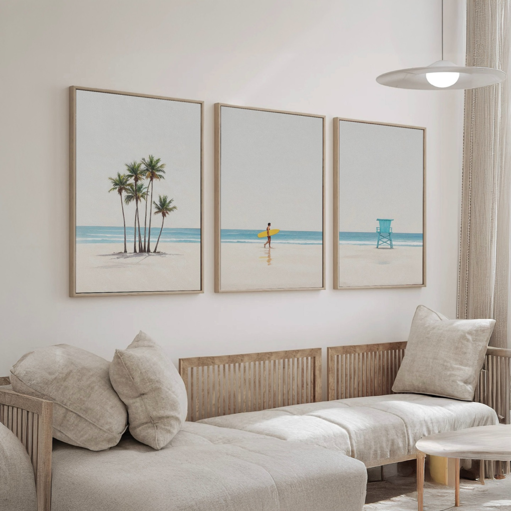 Relaxed gallery wall with beach-inspired artwork