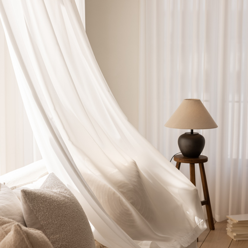 Sheer white curtains moving with ocean breezes