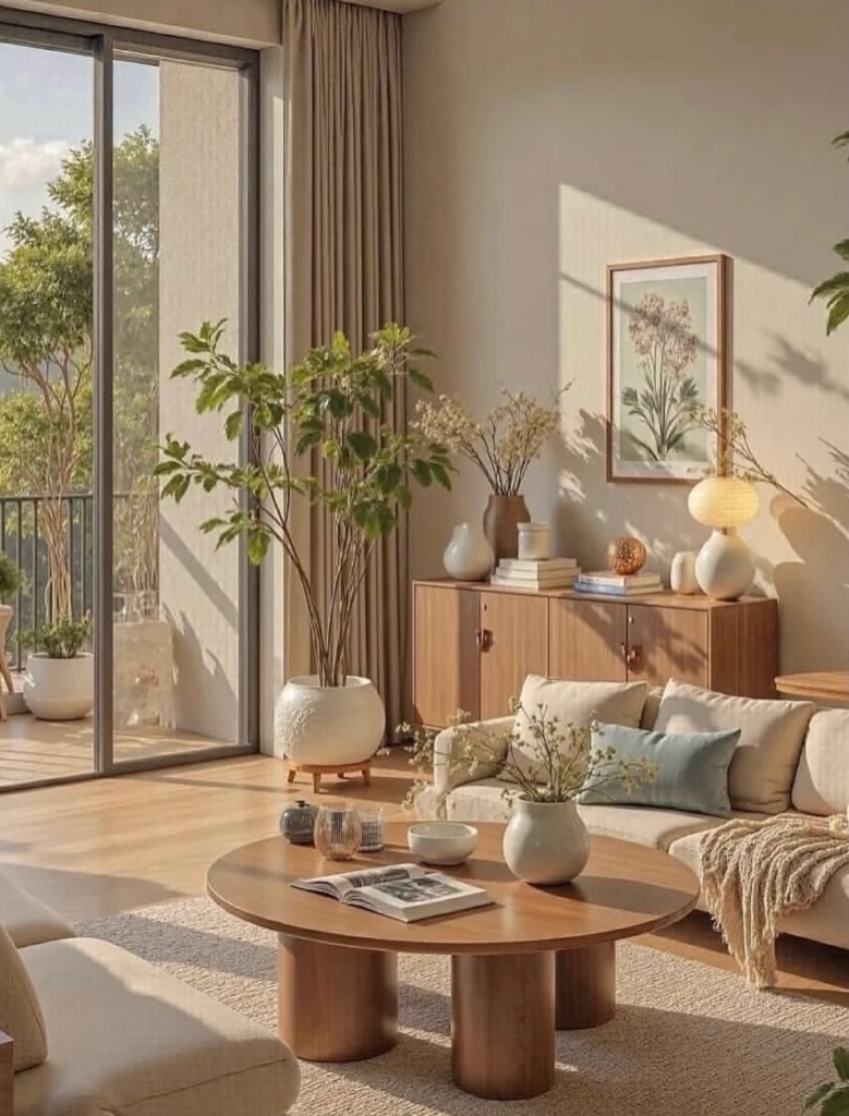 The gentle light accentuates the rich grains of wooden furniture, the woven fibers of rattan accents, and the plush softness of linen fabrics, creating an inviting and cozy atmosphere.
