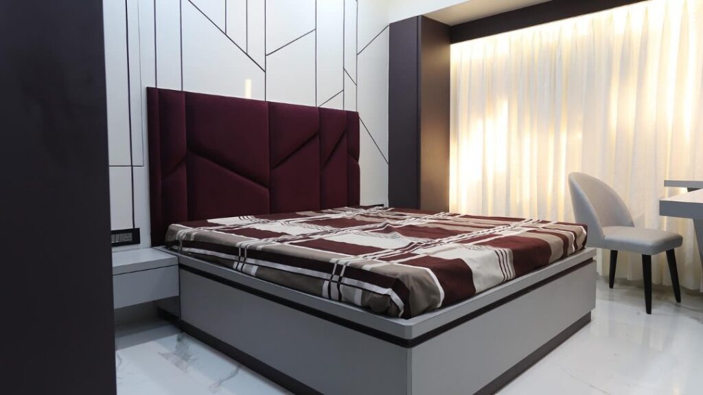 Vertical geometrical lines behind the wall of the room and a burgundy headboard, a matching bedsheet, add a rich texture to your bedroom.