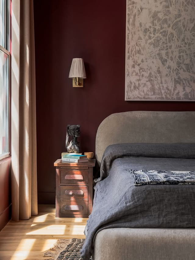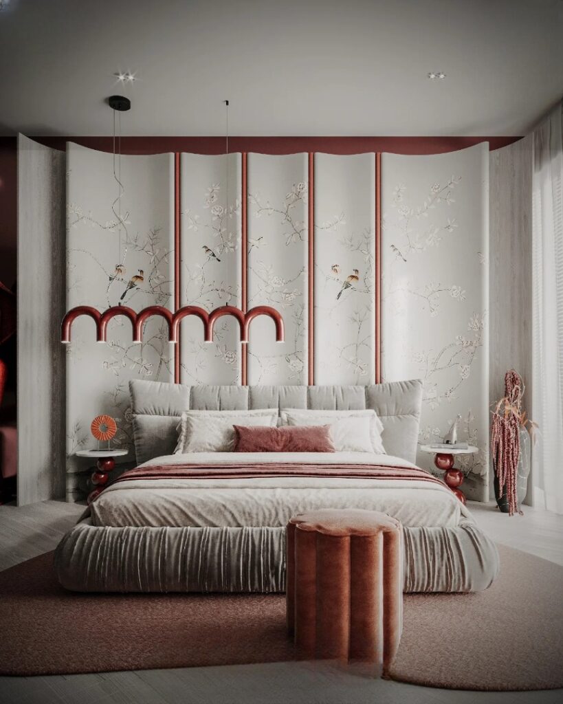 Burgundy accent wall, a round shape moulding which is the headboard of the bed and a classy blend of white with the boxed floor tiles, making your bedroom minimalist, moody and rustic.