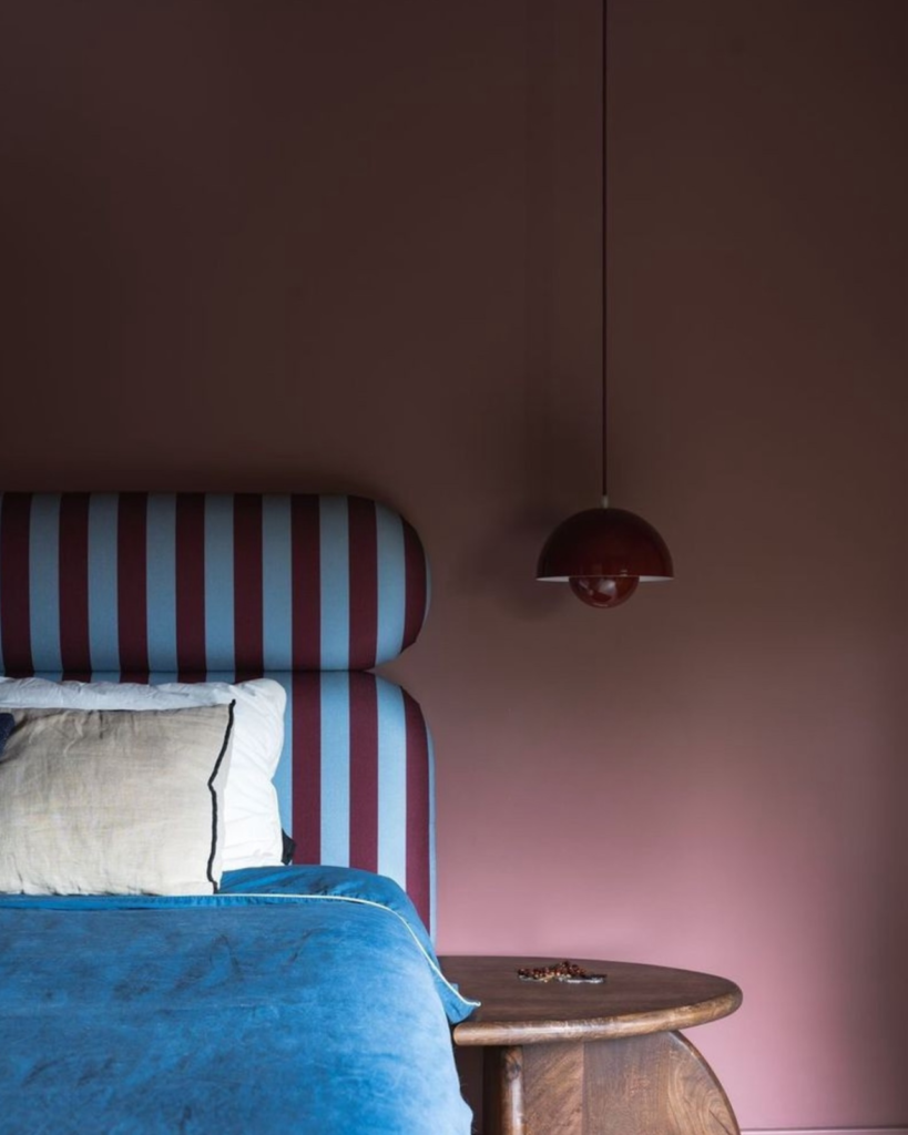 The vertical burgundy stripes on a bold headboard against a matte and dusty rose wall,