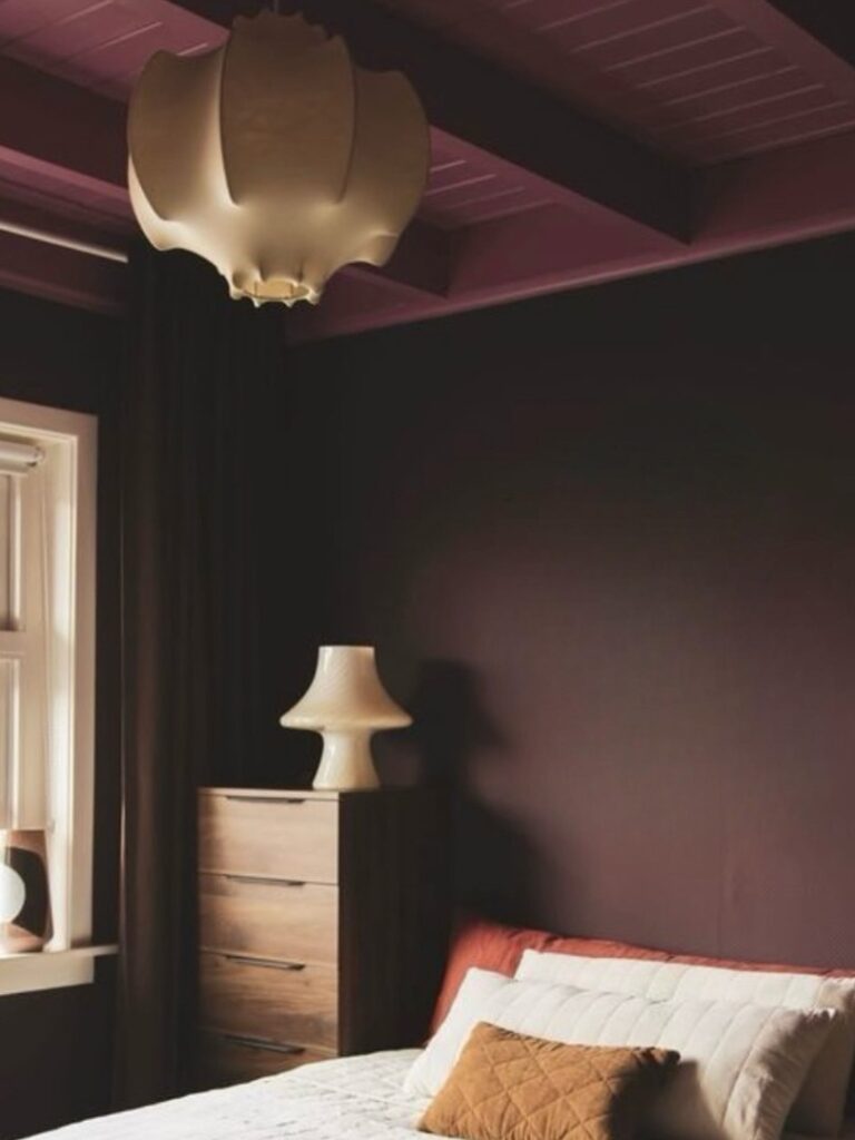 A bedroom in the shadow of burgundy is a symbol of calmness, richness and warmth.