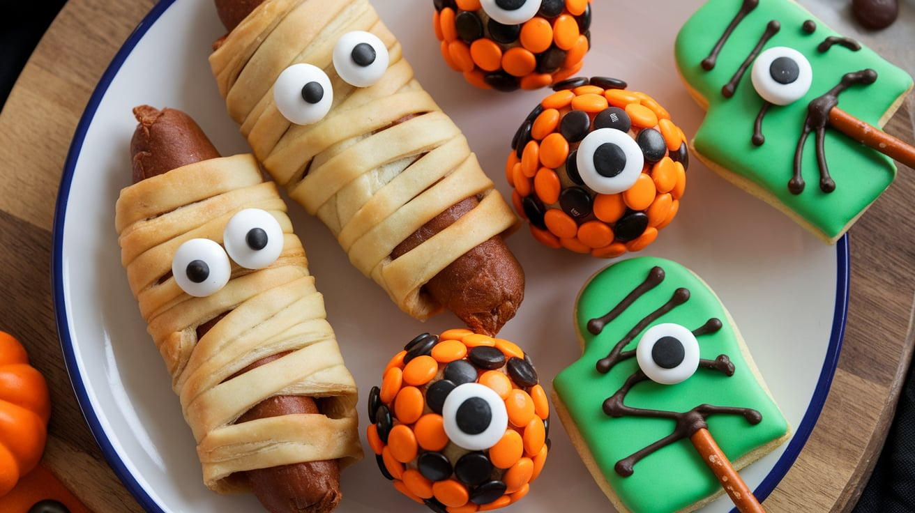 Wrap crescent roll dough around hot dogs, leaving little gaps for “eyes.” Bake until golden, then dot mustard or ketchup for pupils. They’re ridiculously simple, but they always get a laugh.