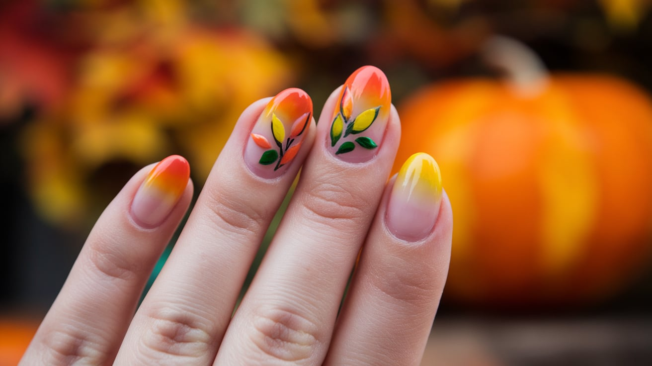 For a minimalist take, stick with nude nails and add small fall leaves in red, gold, or green. A perfect design if you want subtle seasonal flair.