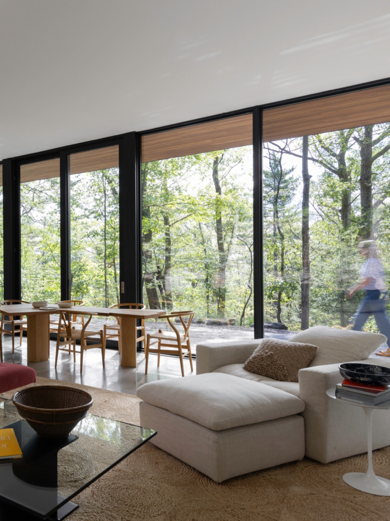 A glass wall is a great way to maximize the view from your forest home. With a forest view, you can enjoy the changing scenery all year long.