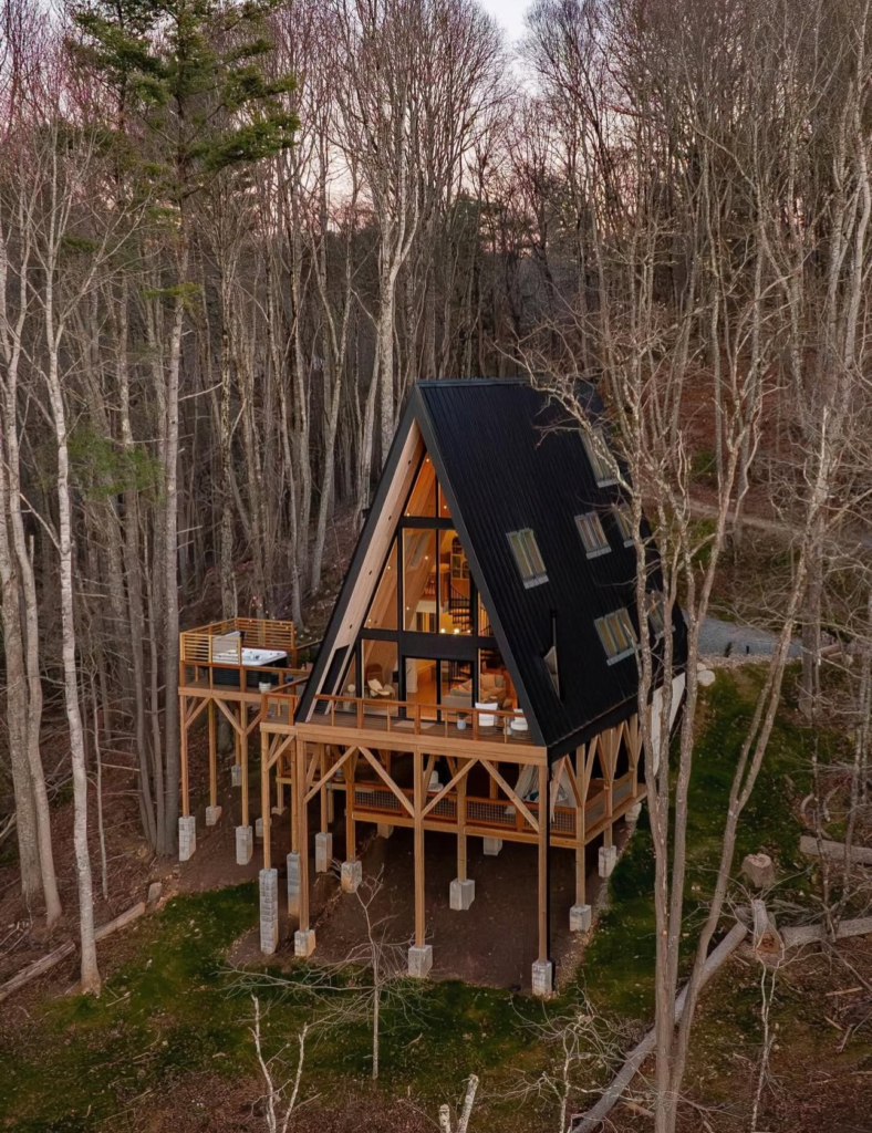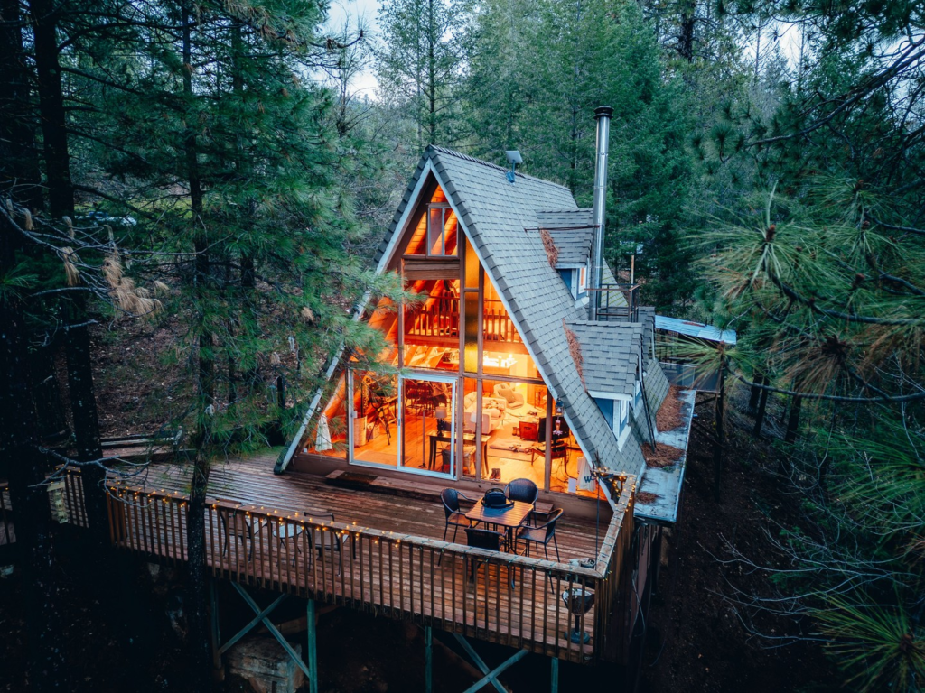 The A-frame cabin is a classic design for a house in the woods. This style is known for its steeply sloped roof that creates a triangular shape on the front and back of the house.