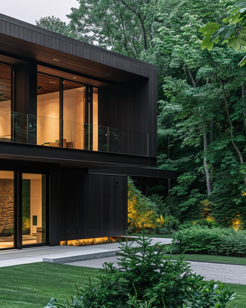 This home is surrounded by a lush forest and the dark exterior helps it to blend in.