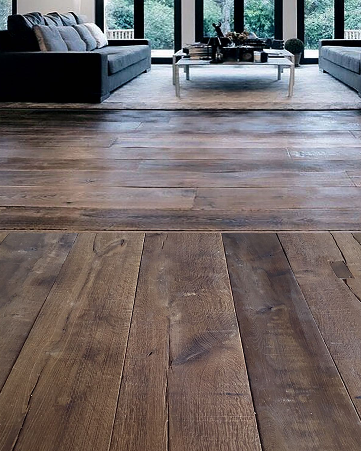 Weathered wood floors can be made from reclaimed wood or created using a variety of staining and distressing techniques.