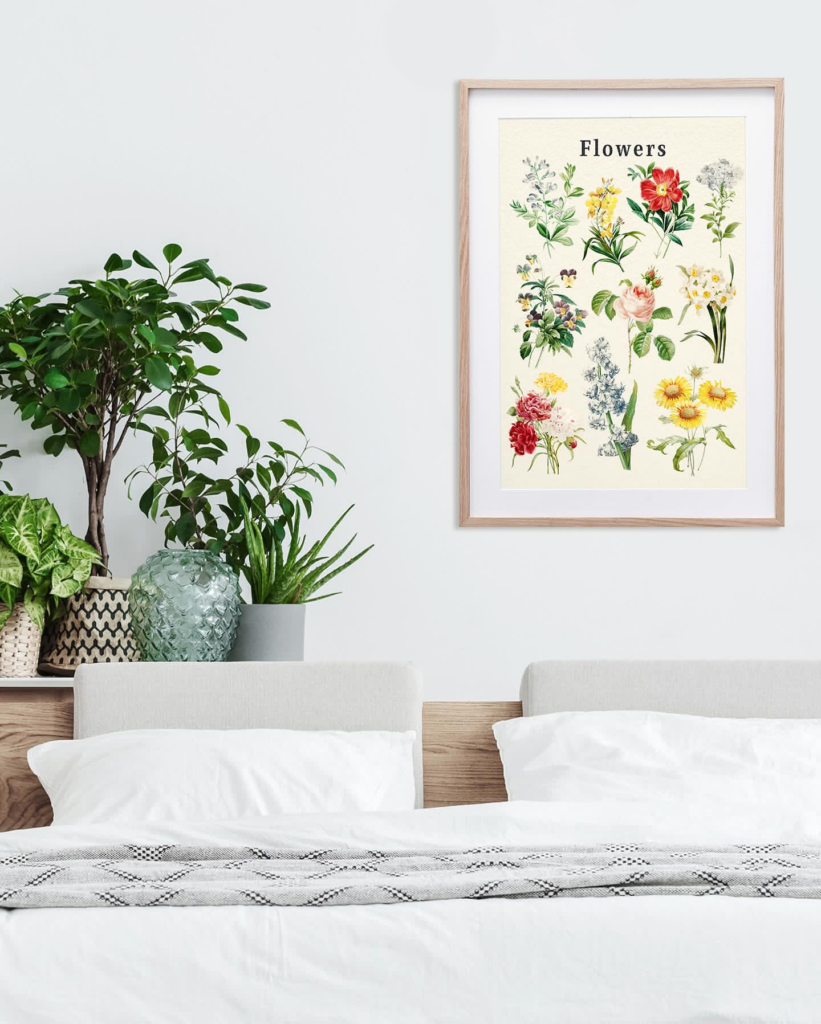 The collection of framed prints includes a variety of plant life, from ferns to budding flowers.