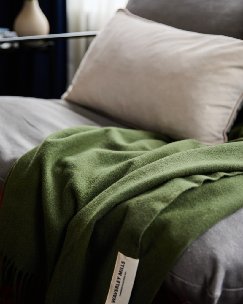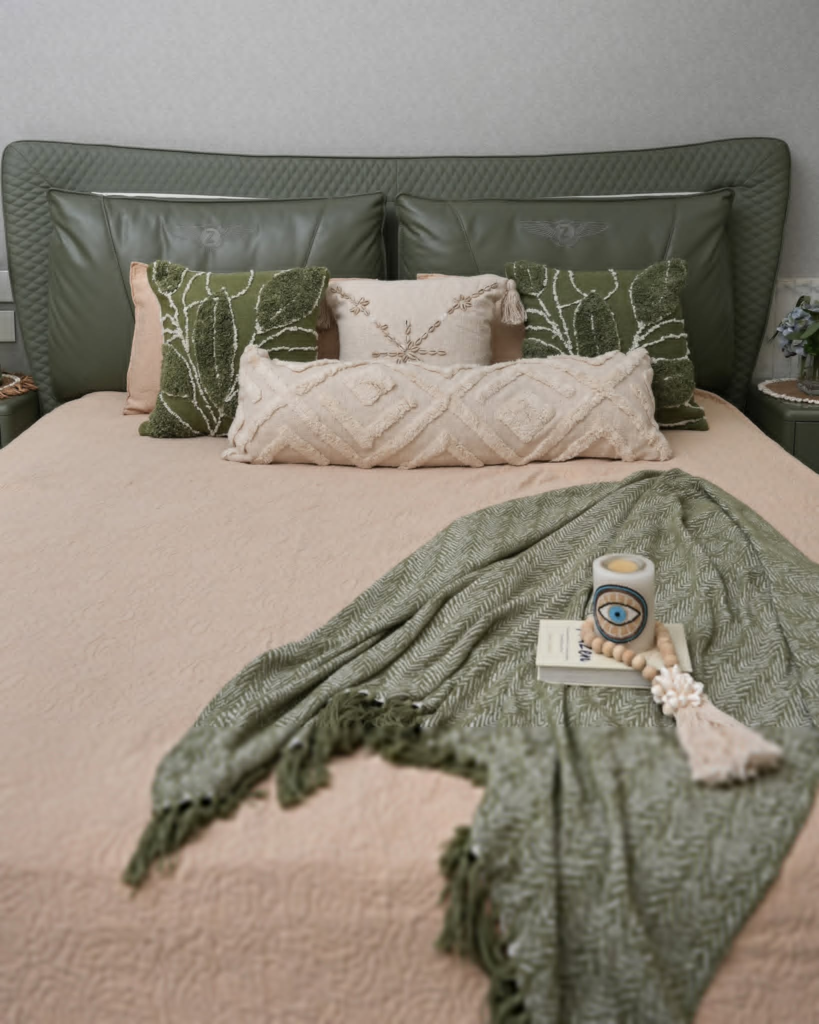 The moss green color of the blanket is picked up in the throw pillow and the plant on the nightstand, creating a cohesive look.